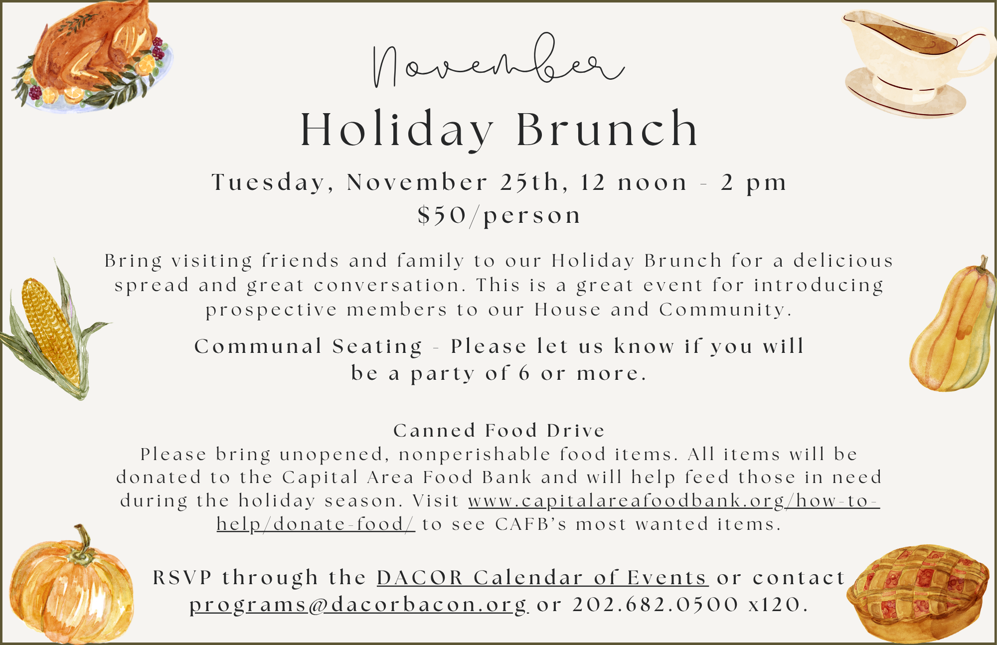 Join us for our annual Holiday Buffet Brunch. Bring visiting friends and family for a delicious spread and great conversation. This is also a great opportunity for introducing prospective members to our House and Community.