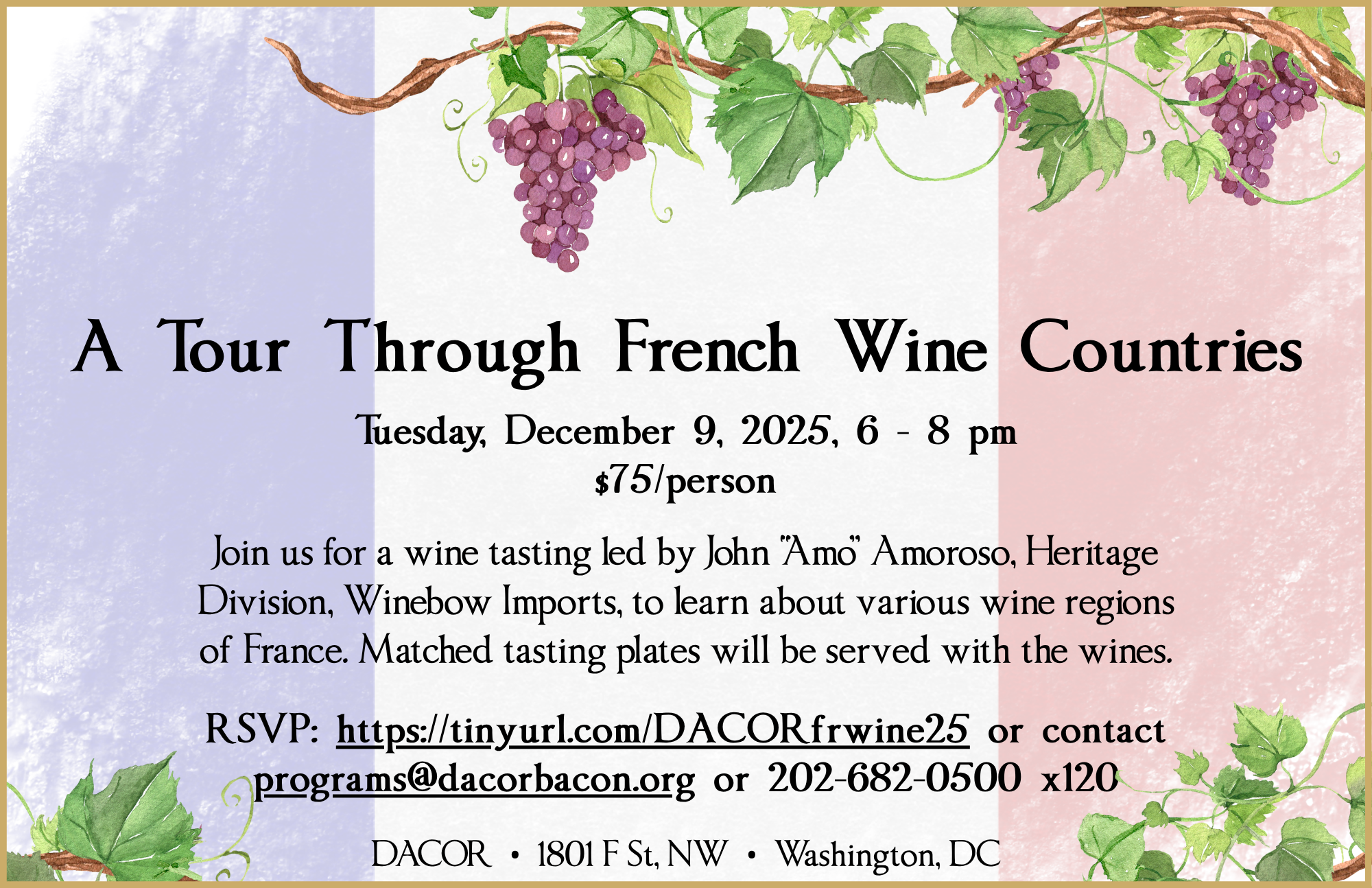 Join DACOR this December for a French wine tasting that will feature various regions including Beaujolais, Bordeaux, Burgundy, Jura, Provence and the Rhône Valley. Matched tasting plates will be served with the wine. The tasting will be led by John "Amo" Amoroso, Territory Manager in the Mid-Atlantic for the Heritage Division of Winebow Imports. Amo represents a portfolio of fine wines imported from a number of family-owned estates within Italy, France, Spain, Portugal and Greece. He will go into detail about the regions and wines themselves for an educational journey through French terroirs.