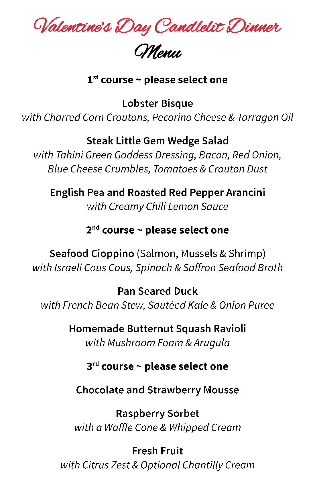 The dinner will feature a three-course gourmet meal with the option of adding a drink package (includes a choice of wine/digestif per course). Please indicate your meal selections when registering (menu below).